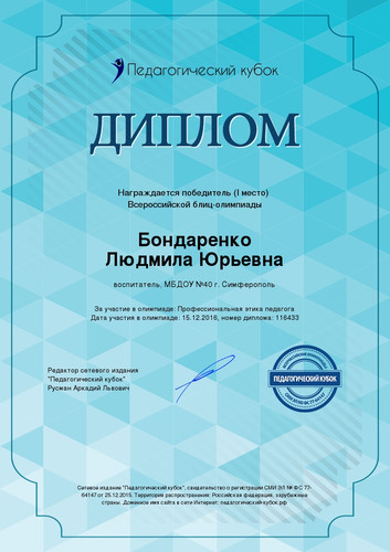 Диплом за I место Победителю Всероссийской блиц-олимпиады. Профессиональная этика педагога.
